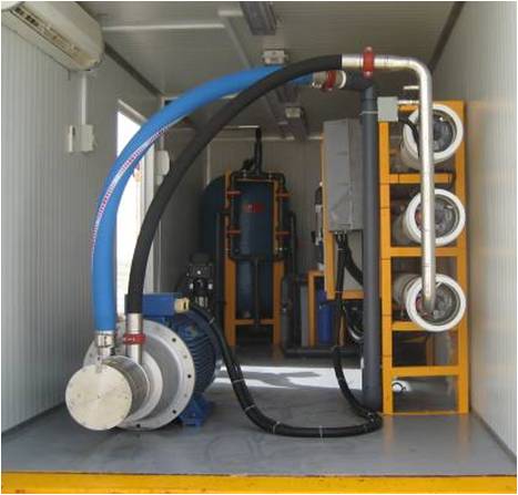 设备简介:6T/H 移动式海水淡化系统。 行业用途:海岛、舰船、海上工作平台,海水淡化生活饮用 产水水质:小于50μs/cm 设备流程:原水→多介质过滤器→活性炭过滤器→精密过滤器→中间水箱→反渗透设备→纯水储水箱→纯水泵→后置保安过滤器→用水点